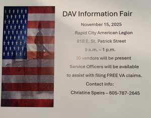 The next DAV (Disabled American Veterans) information fair in Rapid City is scheduled for November 15, 2025, from 9 a.m. to 3 p.m. at the American Legion, located at 818 E. St. Patrick Street. The event is hosted by DAV Chapter #3 and aims to connect veterans with information about earned benefits and services from around 30 vendors.